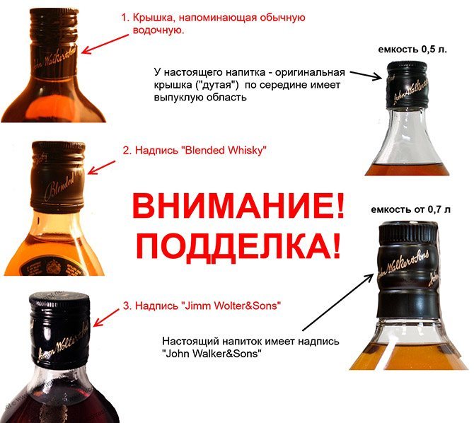 Следует отметить, что виски Johnnie Walker очень часто подделывают. У всех марок крышка от бутылки должна быть «выдувной», по форме напоминать бочку с кружком наверху, а не как у обычной водки. Хотя они тоже умеют подделывать, мы все же можем отличить заводскую обложку от ручной работы. По диагонали на крышке надпись — ВСЕГДА — John Walker & Sons, надписи Jimm Wolter & Sons, Blendet Whisky и другие дают подделку. Этикетка — на всех марках выпуклое тиснение, если провести по нему рукой, вы должны почувствовать буквы, если этикетка гладкая — это контрафактный спирт.