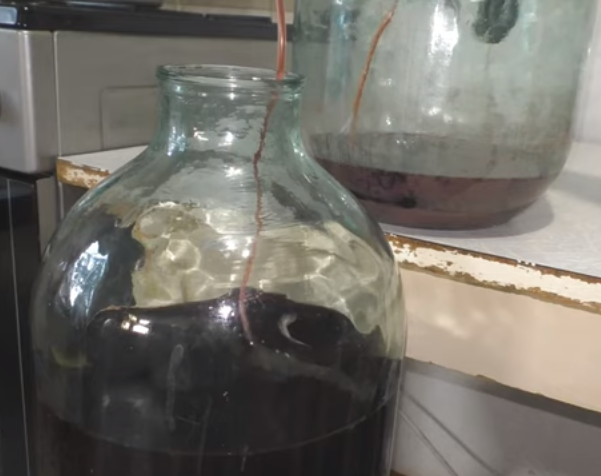 10. Когда брожение прекращается, что каждый винодел определяет по отсутствию бульканья в водяном затворе или по выдуванию перчатки и осветлению виноматериала, вино удаляется от осадка с помощью соломинки.