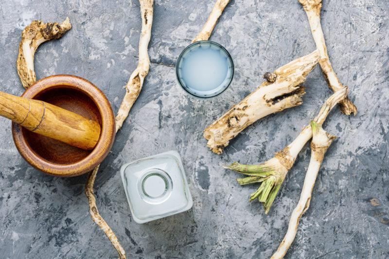 - Основной ингредиент настойки – хрен и водка, любая алкогольная основа спирт либо самогон. Пропорции хрена на 500 мл водки (или другого алкоголя) должны составлять около 50 грамм очищенных и измельчённых корешков.