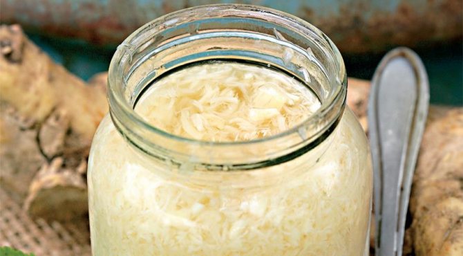 - Имбирно-хреновую кашицу солим, поливаем лимонным соком и оставляем на 5 минут.