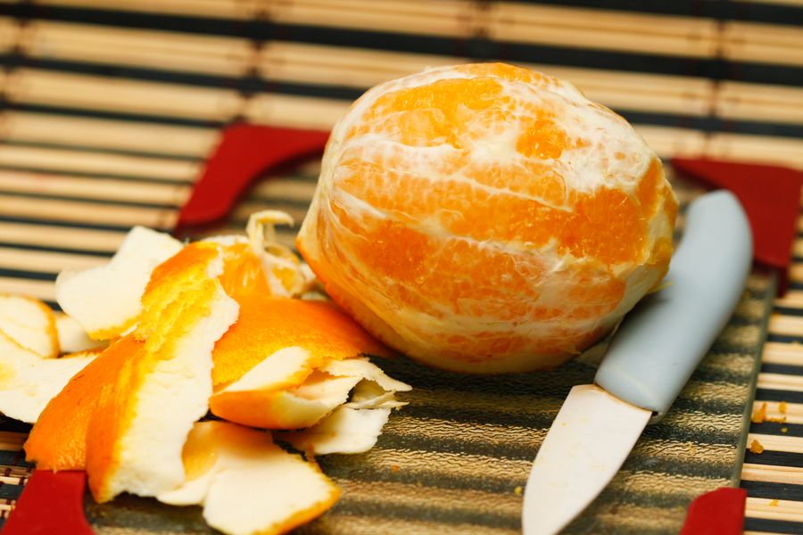 - Очищаем апельсины от корки и белой подкожной плёнки. Плоды придется чистить примерно как картошку, поэтому отходов будет довольно много.