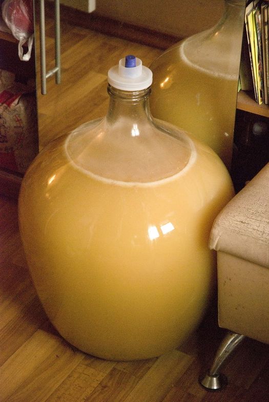 - В бродильную ёмкость выливаем сок и воду, добавляем сахар и изюм. Интенсивно перемешиваем, ставим гидрозатвор и уносим в тёмное место на 5–40 дней.