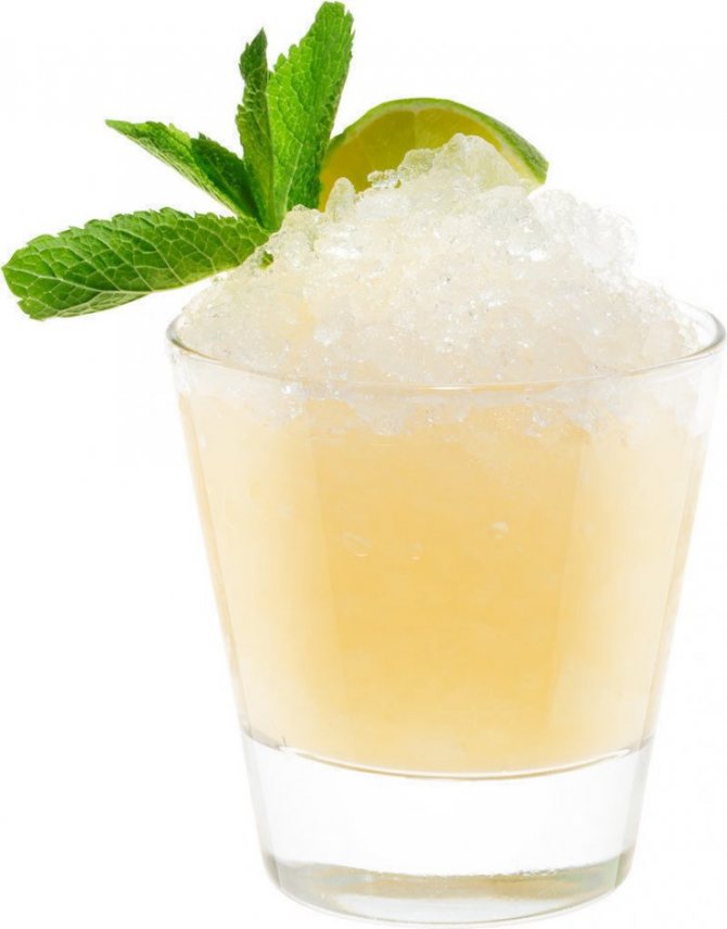 - Колотый лед нужно налить в стакан для маргариты и залить содержимым шейкера.