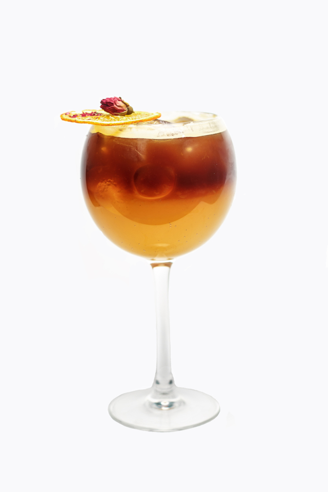 Все ингредиенты переливают в стакан со льдом и аккуратно перемешивают. Коктейль украшен долькой вишни и лимона.