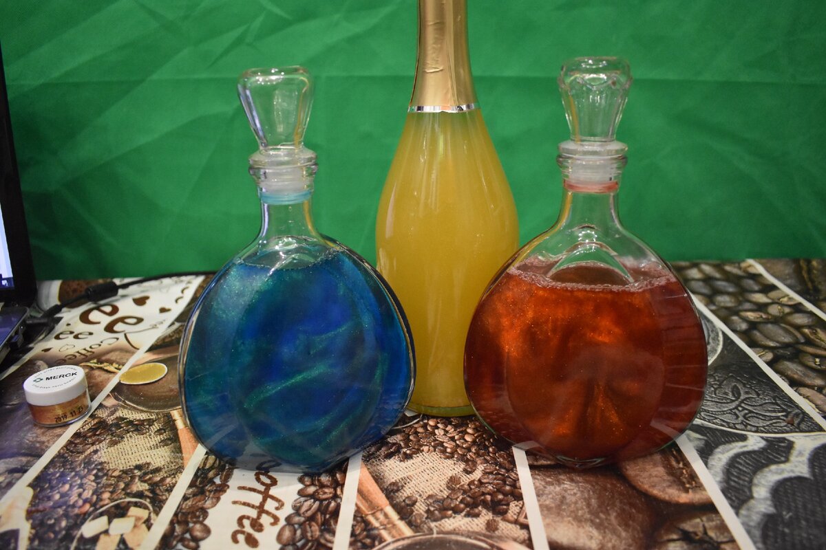 Далее был мой простой белый самогон. Я не знал как поведёт себя кандурин в белом самогоне. Добавил так же совсем немного. И всё получилось просто превосходно. Не смотря на то что самогон был белый блёстки придали ему красивый переливающийся цвет.