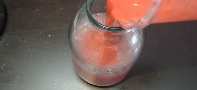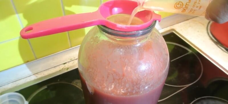 - Слейте его, замерьте, сколько выделилось. Посчитайте количество сахарного песку. На литр сока берите 100 гр. сладости.