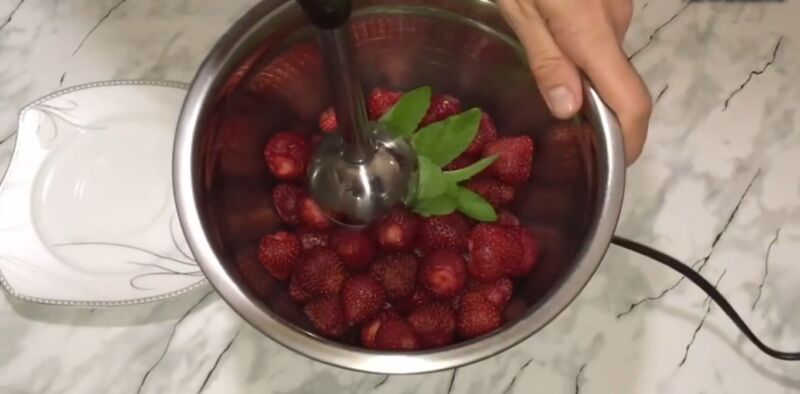Изначально перемойте и переберите клубнику походу удаляя листочки. Сложите ягоду в кастрюлю и добавьте к ней веточку мяты. Всё перемалываем погружным блендером в пюре.