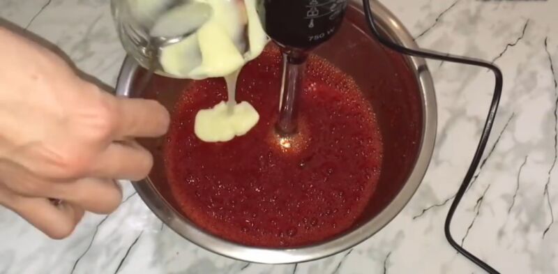 К получившейся массе отправляем обычное сгущенное молоко и всё хорошенько перемешиваем. Цвет пюре сразу же значительно посветлеет.