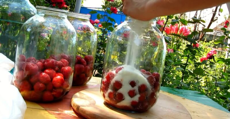 - Заранее подготовленные плоды клубники укладывают в стеклянную посуду. После чего вносят сахар и водку.