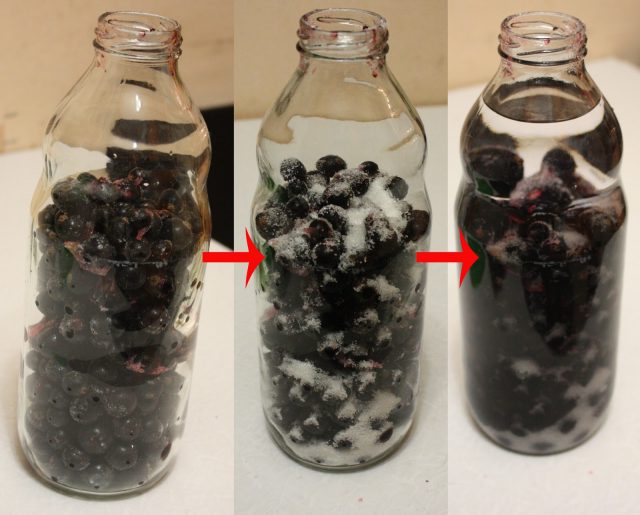- Очищенные ягоды перелейте в бутылку, чередуя слои смородины с сахаром.