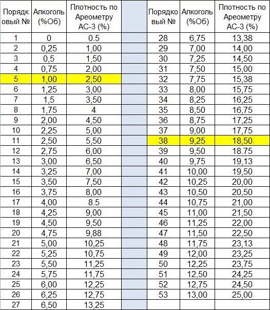 - С помощью таблицы считаем разницу и определяем спиртуозность готовой браги.