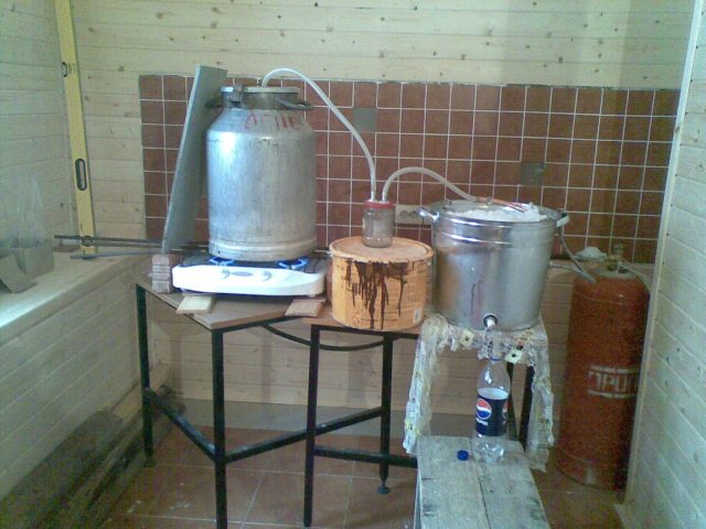 С помощью двух бутылок с водой и соединяющего их шланга можно сделать самогон и использовать его даже в лесных условиях. Затор переливают в металлическую колбу и ставят на огонь (например, на огонь), а другую (тесно связанную с первой трубкой) помещают в емкость с водой или в ручей, или в озеро.