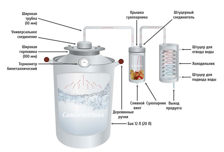 Рассмотрим теперь каждый элемент устройства отдельно. Давайте узнаем, как сделать это дома. И как в итоге объединить все подготовленные элементы дистиллятора в один аппарат.