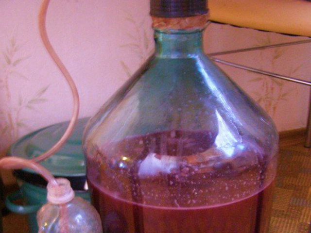 Через 2 недели брожения влейте 1,5 литра сусла и растворите в нем еще килограмм сахара. Влейте сироп в бродящее вино, закройте его гидрозатвором.