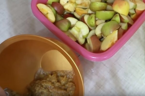 - Яблоки перебрать, сердцевину и перекрутить на мясорубке. Вылейте сок из яблок и их пирога в банку подходящего размера.
